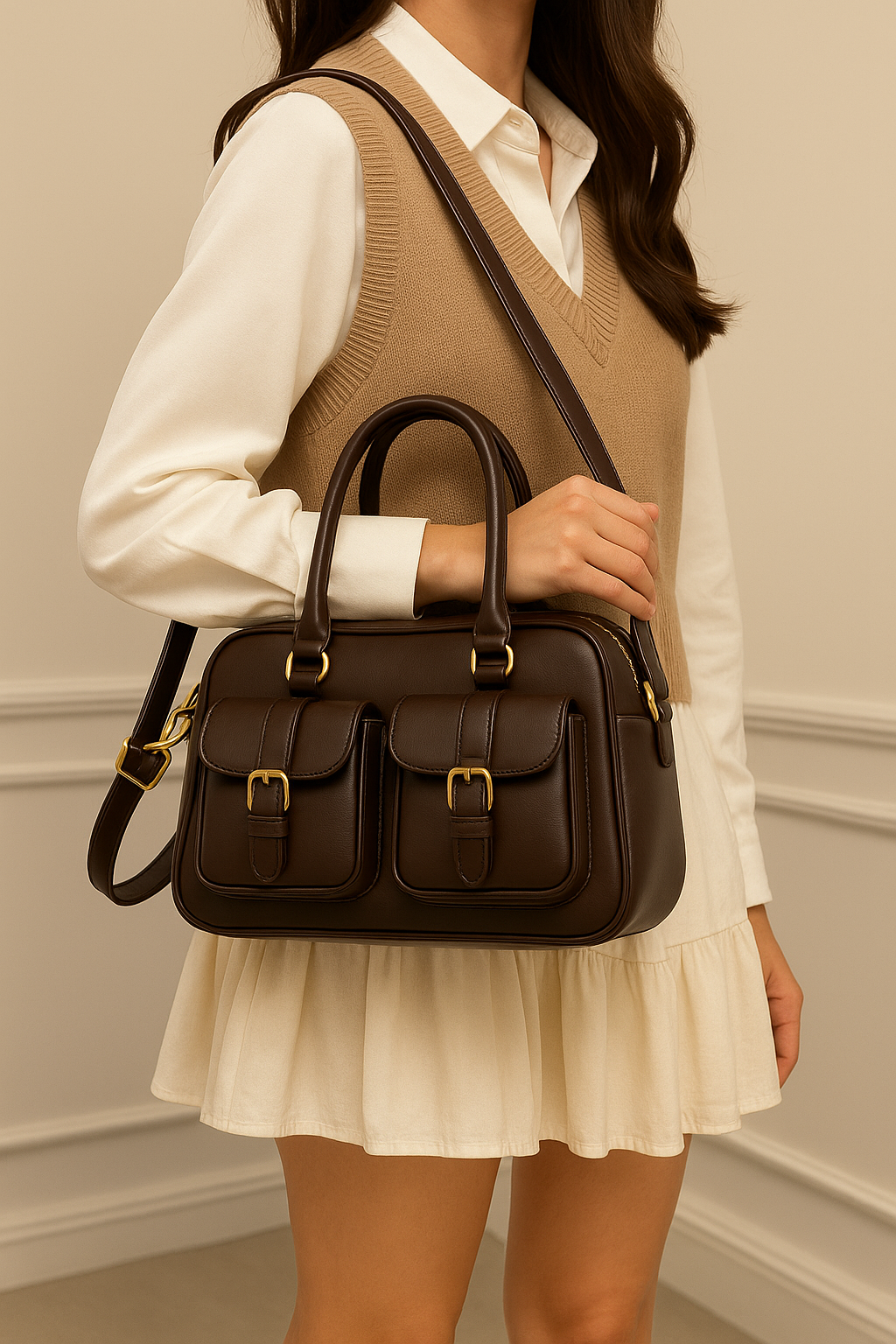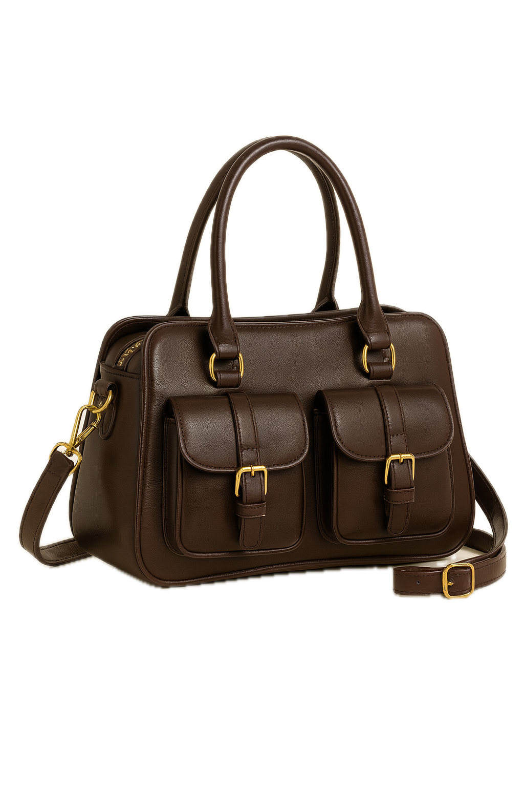 Classic sophistication meets modern functionality. This structured satchel features dual buckle closures, gold-tone hardware, and a timeless silhouette inspired by vintage design. The rich leather and meticulous stitching showcase exceptional craftsmanship, while the adjustable shoulder strap and top handle offer versatile carrying options.